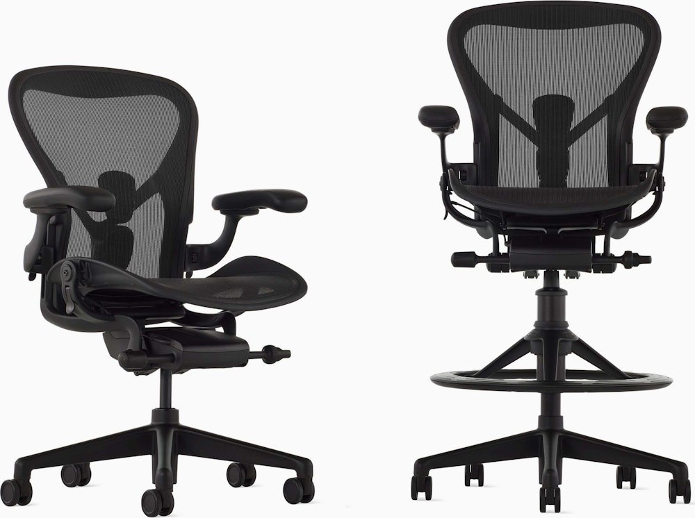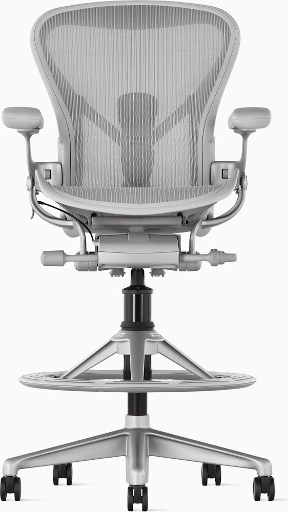 The Aeron Stool revolutionized office seating with its defining design qualities: the pioneering 8Z Pellicle suspension material and its patented PostureFit SL back support, which affords the ideal sitting position—chest open, shoulders back, pelvis tilted slightly forward. Combining a deep knowledge of human-centered design with cutting-edge technology, the Aeron work stool is engineered with state-of-the-art adjustability, including the arms, seat height, depth, and recline.