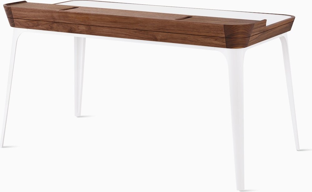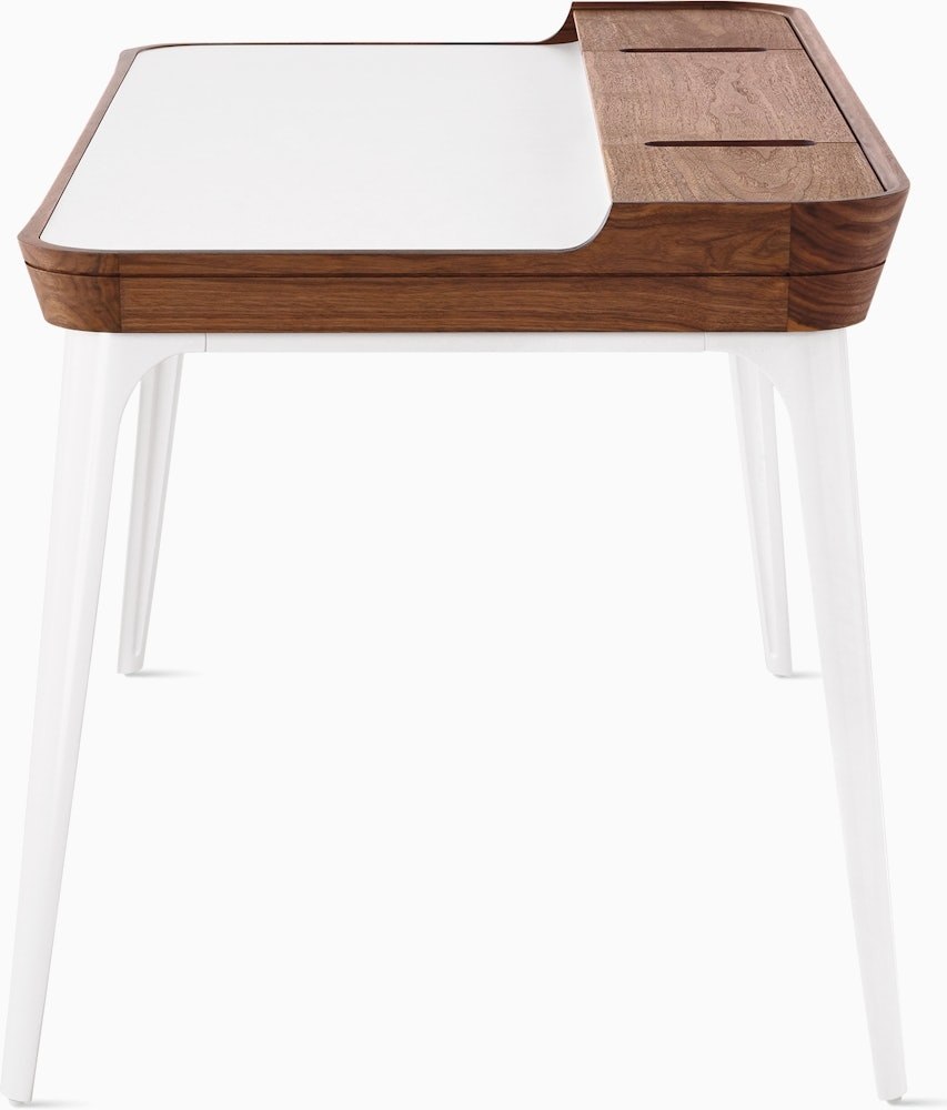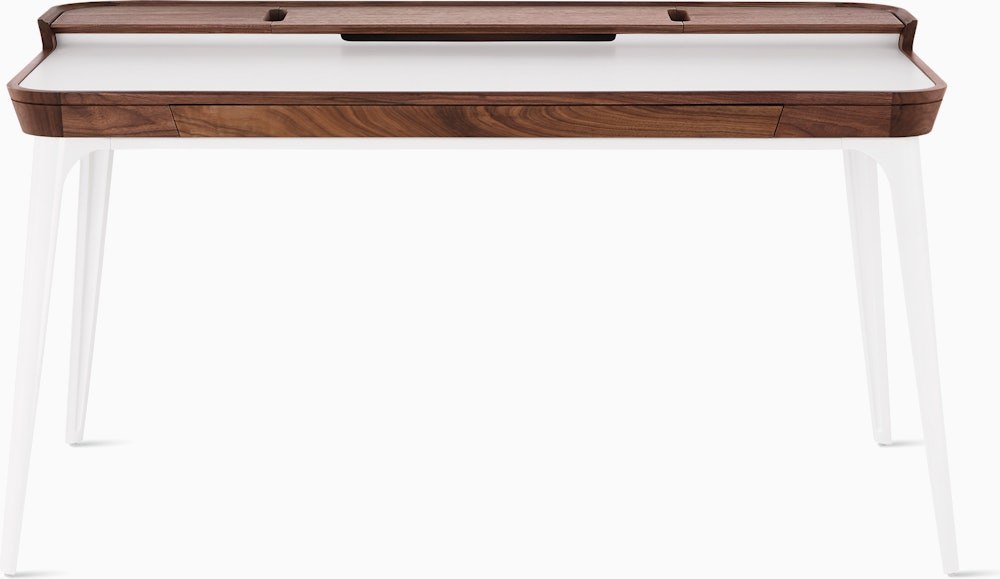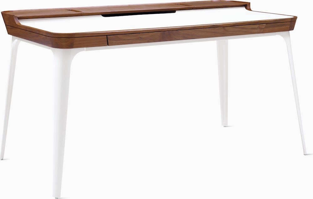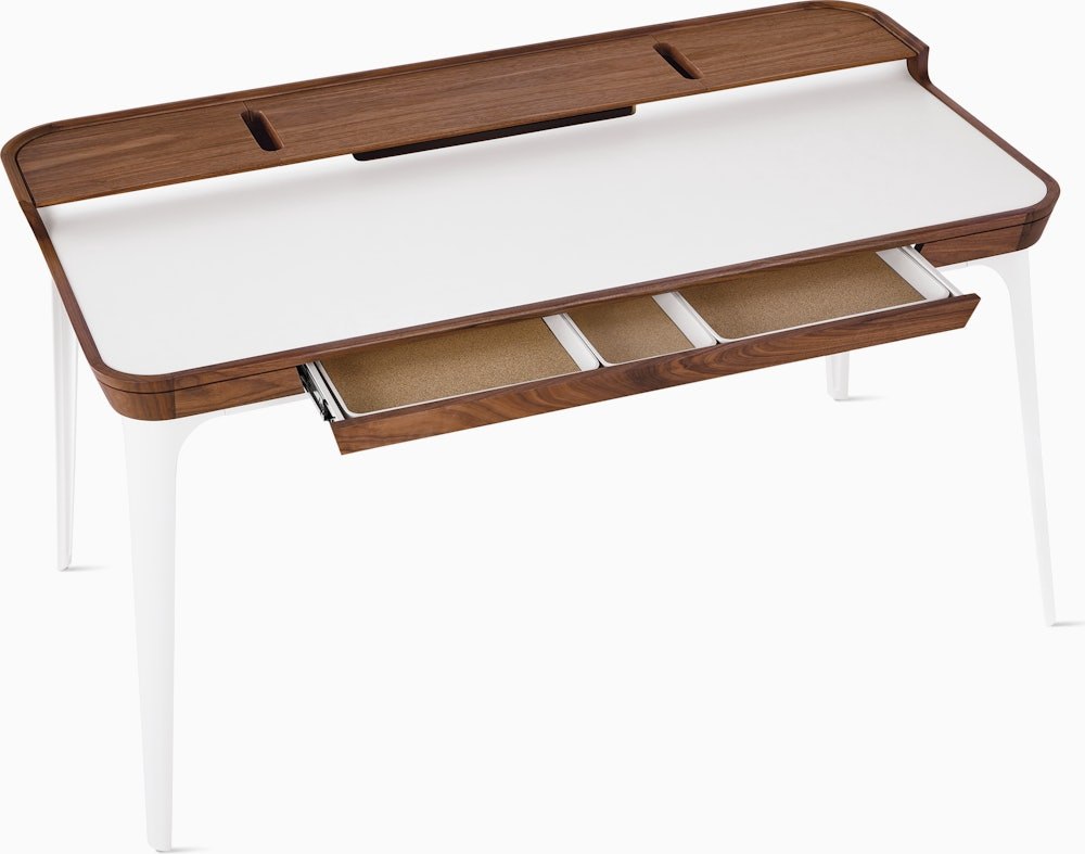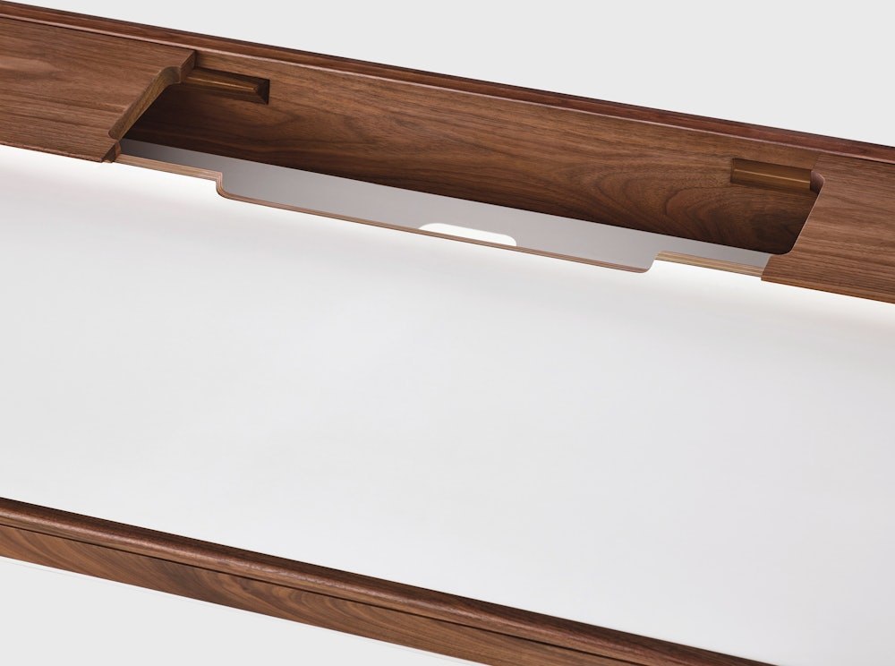 Well-thought-out and comfortable to work on, the Airia Desk (2008) uses clever storage and visual cues to keep you organized and focused. A white laminate inset on the desk’s surface delineates workspace, while a slightly elevated secondary surface provides a place for books, office tools, and refreshments. Three removable covers with cutouts store and route cords and cables.