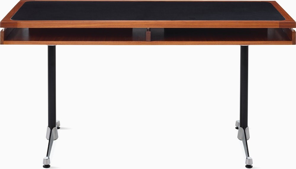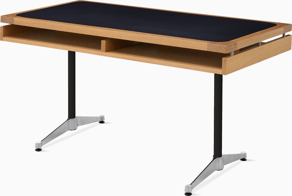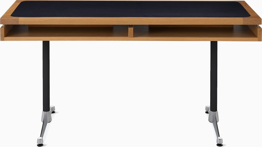 The Eames 2500 Series Executive Desk epitomizes the iterative spirit of its designers. It starts with the strong, clean T-leg design from Charles and Ray Eames’ 2500 Series, a range of multi-use tables that were ahead of their time when introduced in 1961. These are paired with an expansive, raised desktop, which was based on a one-of-a-kind prototype. Available in a choice of premium veneers with a unique leather inlay option, the result is an executive desk you can design a room around—be it the corner office or your home office.
