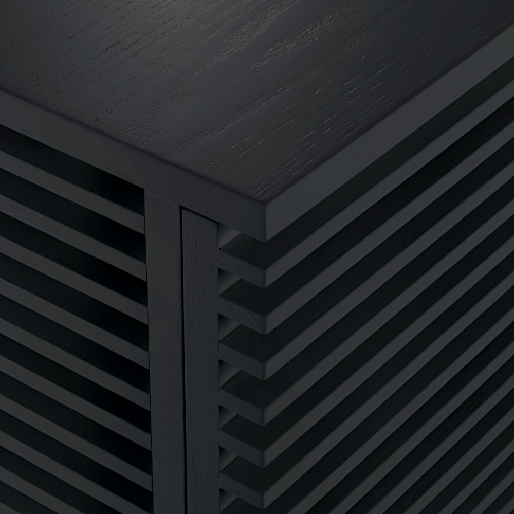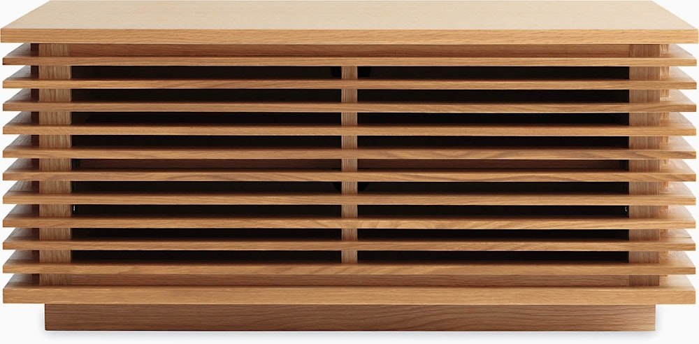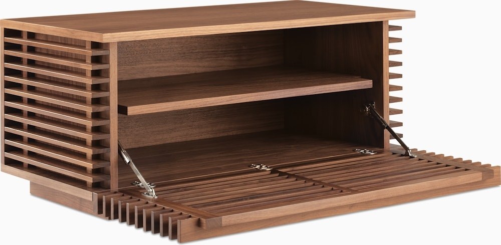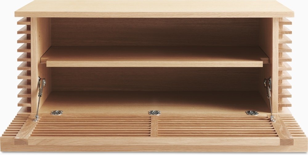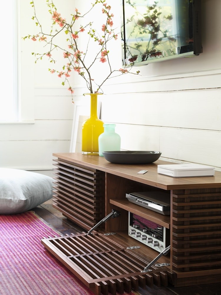 • Sleek design; louvered doors to allow remotes to control devices inside.