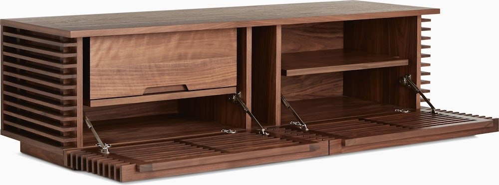• Sleek design; louvered doors to allow remotes to control devices inside.
