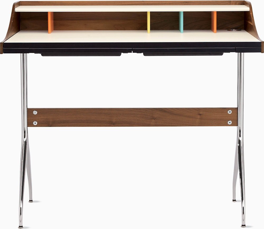 Introduced in 1958 by Herman Miller’s then-design director, George Nelson, the Nelson Swag Leg Desk has retained its relevance over the decades. The cubbies’ brightly colored dividers add a sense of play, while the drawers’ removable organizer trays keep things tidy. Fashioned from 16-gauge steel, the legs of this storage office desk feature leveling floor glides to accommodate uneven surfaces. This is the authentic Nelson Swag Desk by Herman Miller.