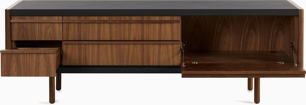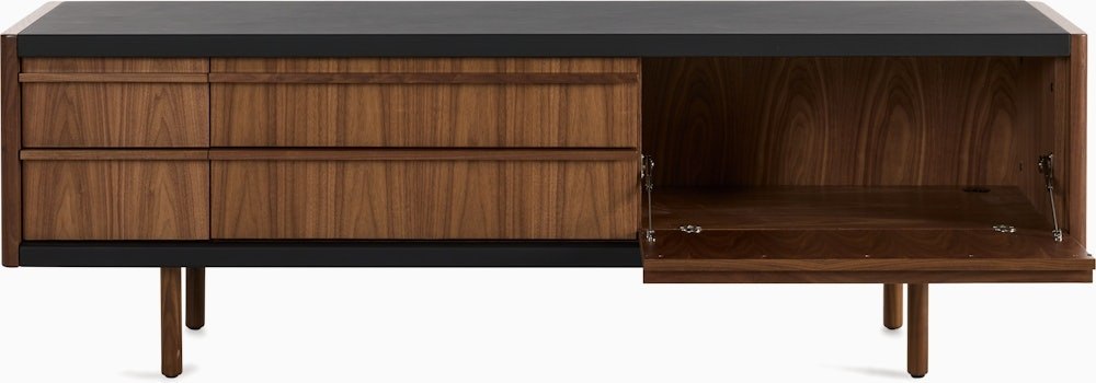- Drop-down cabinet doors provide easy access to remotes, devices, or other items stored inside.